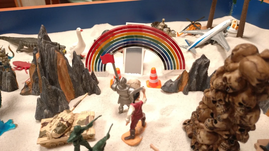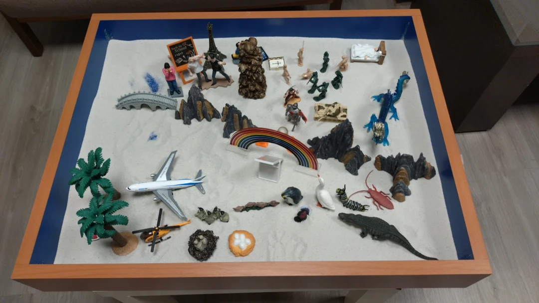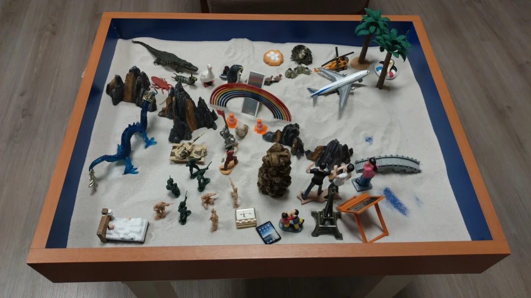 這是第幾次我去找心理諮商了,記不得了。現在才想到可以做心理測驗。依照當下的想法,在諮商室的沙遊桌上擺了我想到的場景。