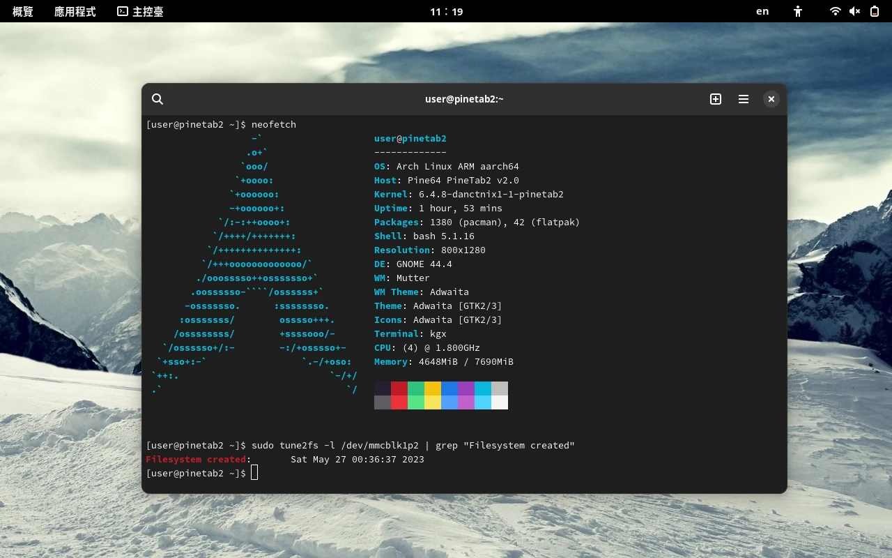 桌面環境我換成GNOME。我知道GNOME和KDE對PineTab 2來說太重型了,但不想因此去用i3這類視窗管理員,太複雜太沒效率了。