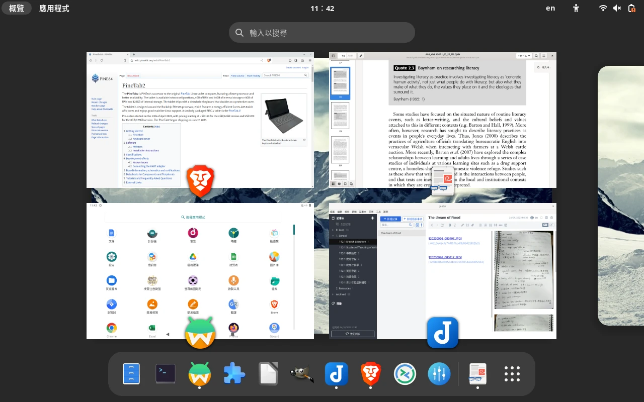 多虧有GNOME,在Android與Linux的環境之間切換十分簡單,用手勢左右滑動切換工作區就行了。比如,有時候要開愚蠢的老舊學校網頁,只能在IE正常列印的情況下,我可以切換到Linux環境,用Firefox類似IE的列印版面功能,成功列印網頁。在此之外,我可以用終端機跑一些批次處理任務。因此,PineTab 2是跟一般Android平板/iPad不一樣的東西,對進階用戶來說它是一台強大的電腦。