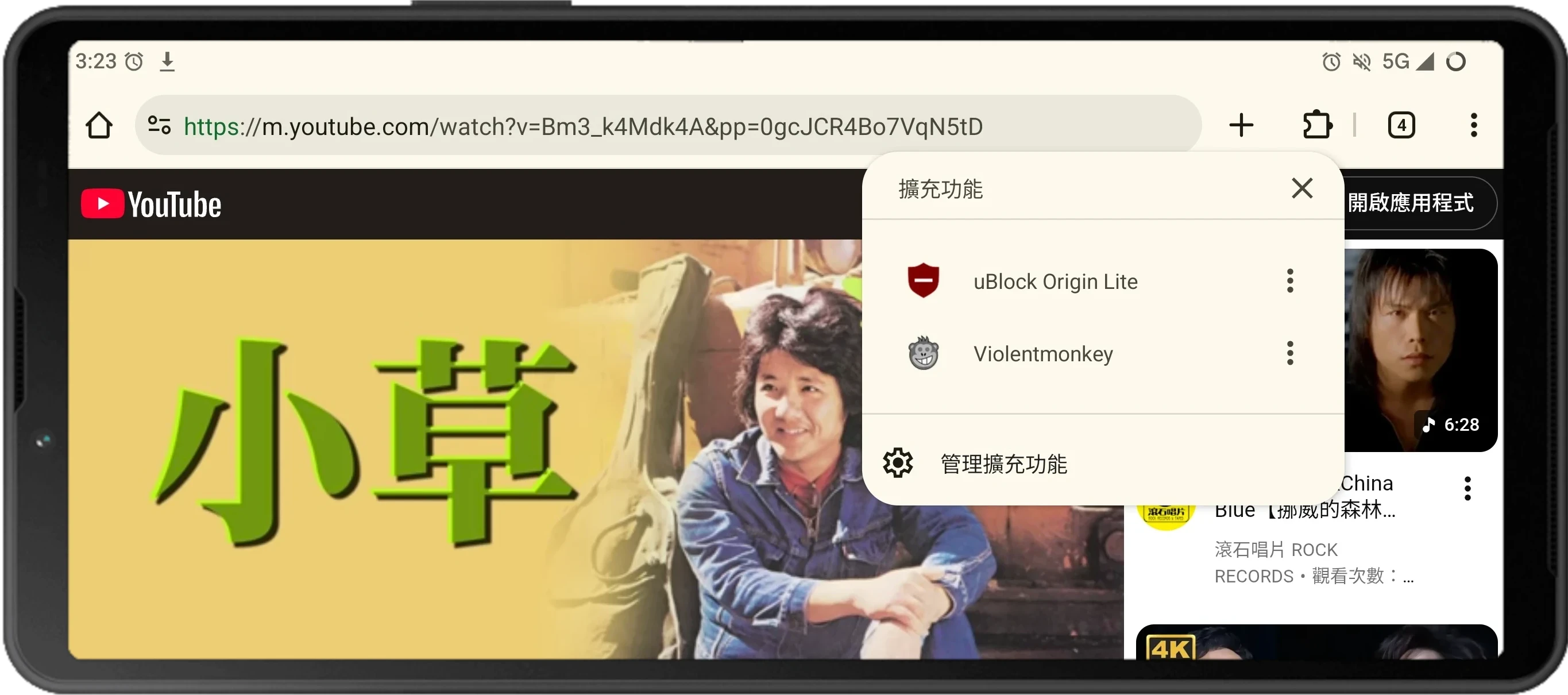 推薦用擴充功能裝ViolentMonkey擴充套件,再匯入想執行的指令稿,成功率較高。例如,這裡有一個允許在背景播放手機版Youtube網頁影片的指令稿:YouTube Mobile Background Playback (Firefox Android)