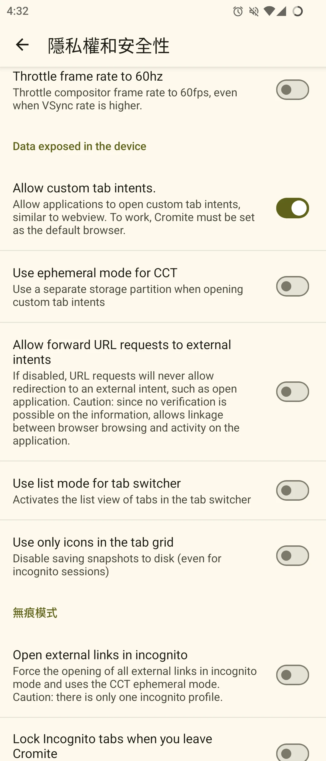 在隱私權與安全性,開啟Allow custom tab intents,這樣其他APP的內嵌WebView就可以用Cromite載入。
