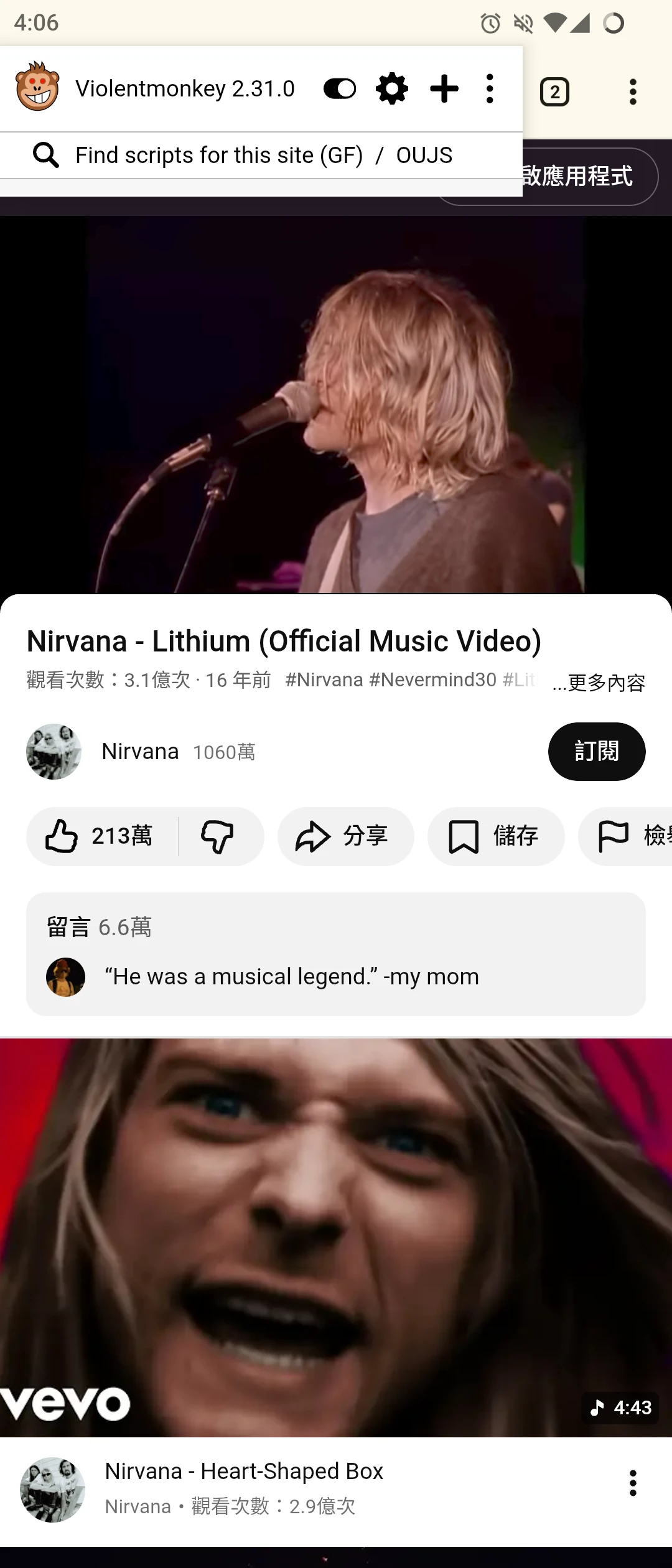 推薦用擴充功能裝ViolentMonkey擴充套件,再匯入想執行的指令稿,成功率較高。例如,這裡有一個允許在背景播放手機版Youtube網頁影片的指令稿:YouTube Mobile Background Playback (Firefox Android)