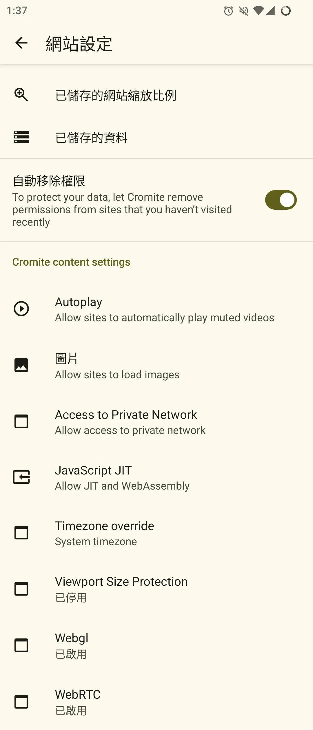為了安全性考量,Cromite的JavaScript JIT、WebGL、WebRTC預設是停用的,ViewPort Protection是保護隱私之用。但是很多網站會需要,建議到網站設定裡面開啟。