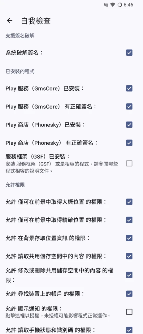 開啟microG,點選「自我檢查」,將要求的功能都全部開啟。並於主畫面勾選「註冊為Google設備」,這樣便可以登入你的Google帳號。