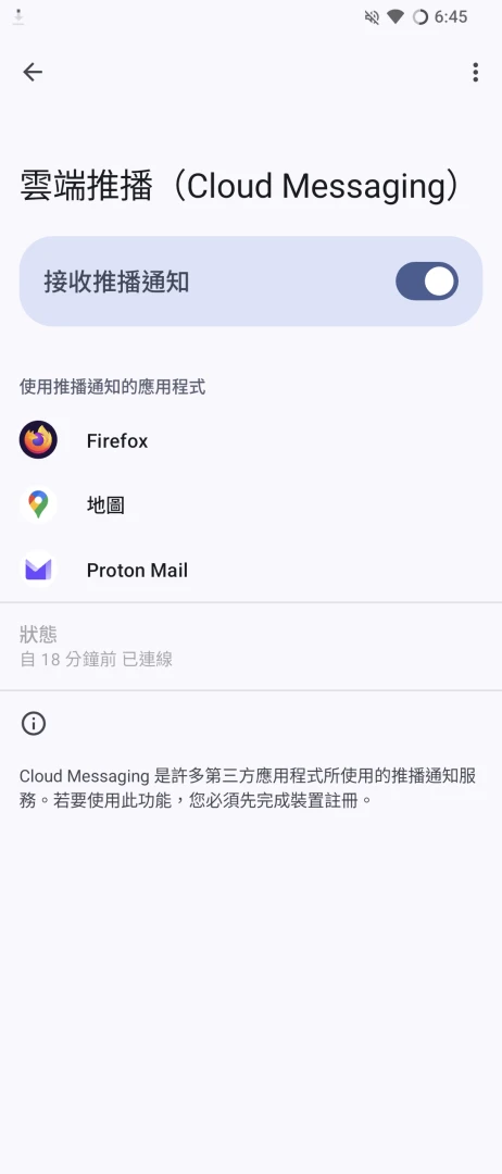 有應用程式要求使用FCM傳送通知時,就會列在「雲端推播(FCM)」。如果你覺得讓Google讀取你的通知不夠保護隱私,請考慮改用UnifiedPush。