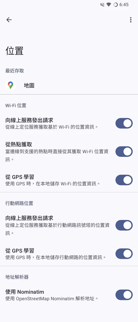 如果要使用導航,手機最好插上SIM卡和開啟Wifi。然後在「位置」勾選這些選項,使用線上position.xyz服務定位。最新版microG已不支援UnifiedNlp的後端服務了。這樣地圖APP的導航才能正常運作。我的經驗是,OsmAnd定位比較慢,Google地圖則是會想辦法用Wifi方式較快完成定位。