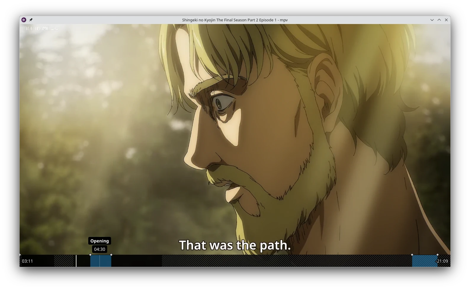 這是獨立的指令稿,用於顯示跳過動畫OP的章節標記。它會以一組MPV播放器的引數呈現,播放影片會顯示一組時間軸標記。