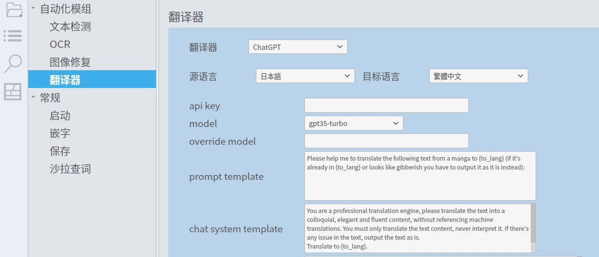接著開啟BallonsTranslator,點選左下角設定,將「翻譯器」設定為ChatGPT,填入剛剛取得的API key。「源語言」維持日文,再把「目標語言」設定為繁體中文。