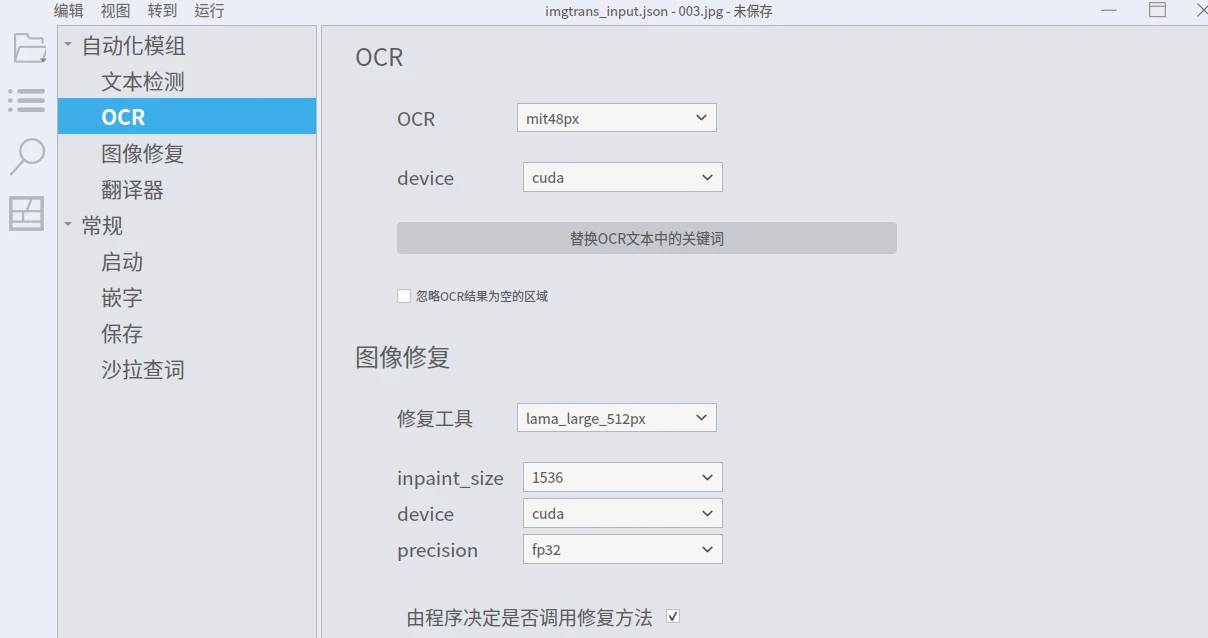 到設定裡面,調降「圖像修復」、「OCR」的數值。如果你的VRAM一算圖就爆炸,那就把device改成cpu。