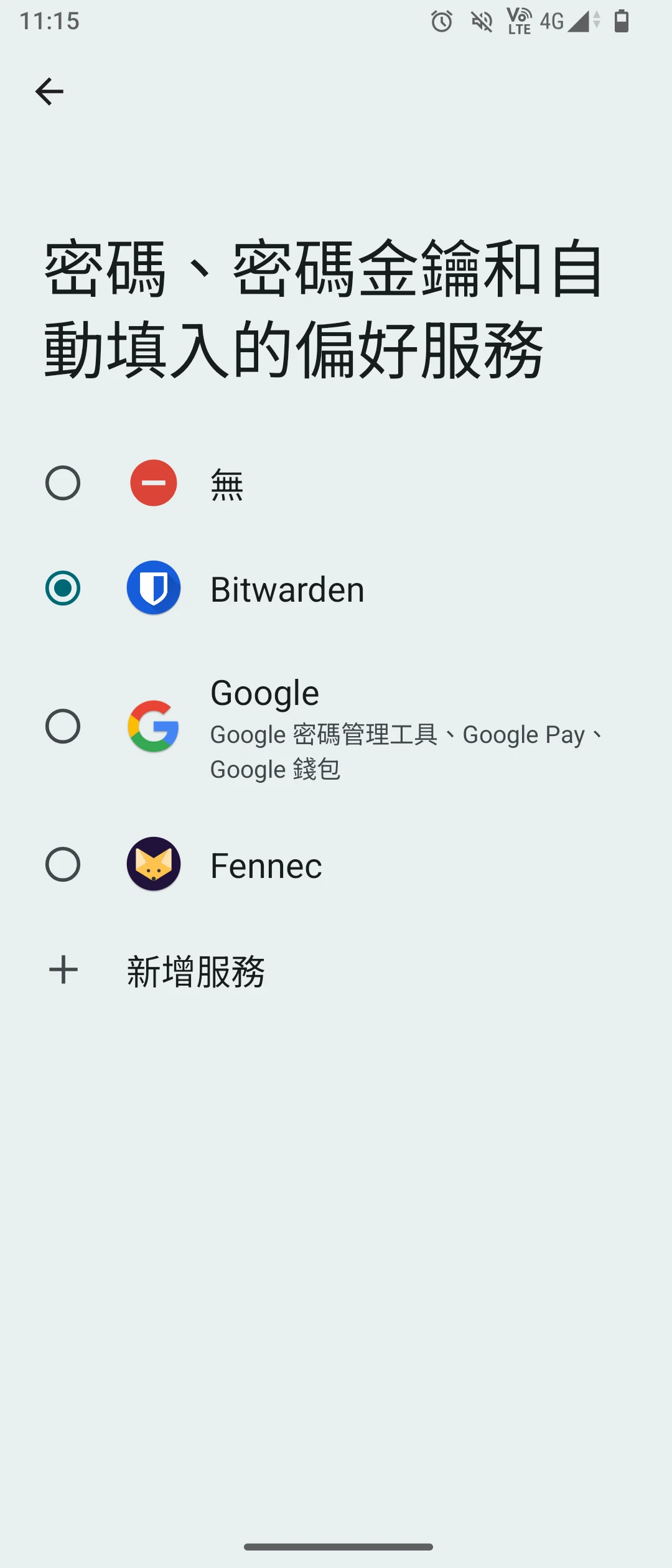 Android到系統設定 → 搜尋自動填入,修改為Bitwarden。Chromium系瀏覽器可能還要在瀏覽器設定,勾選使用外部自動填入服務。