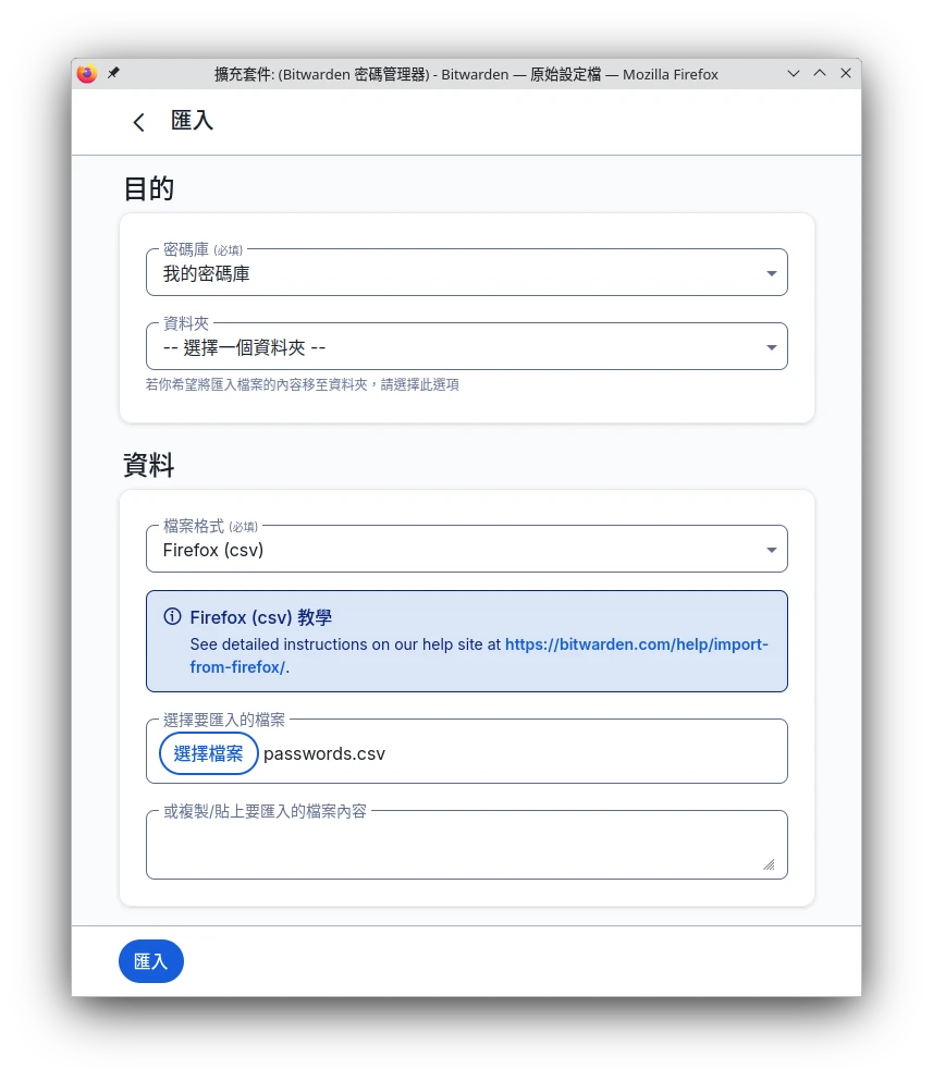 Bitwarden支援從各大瀏覽器遷移密碼,這裡以Firefox為例。