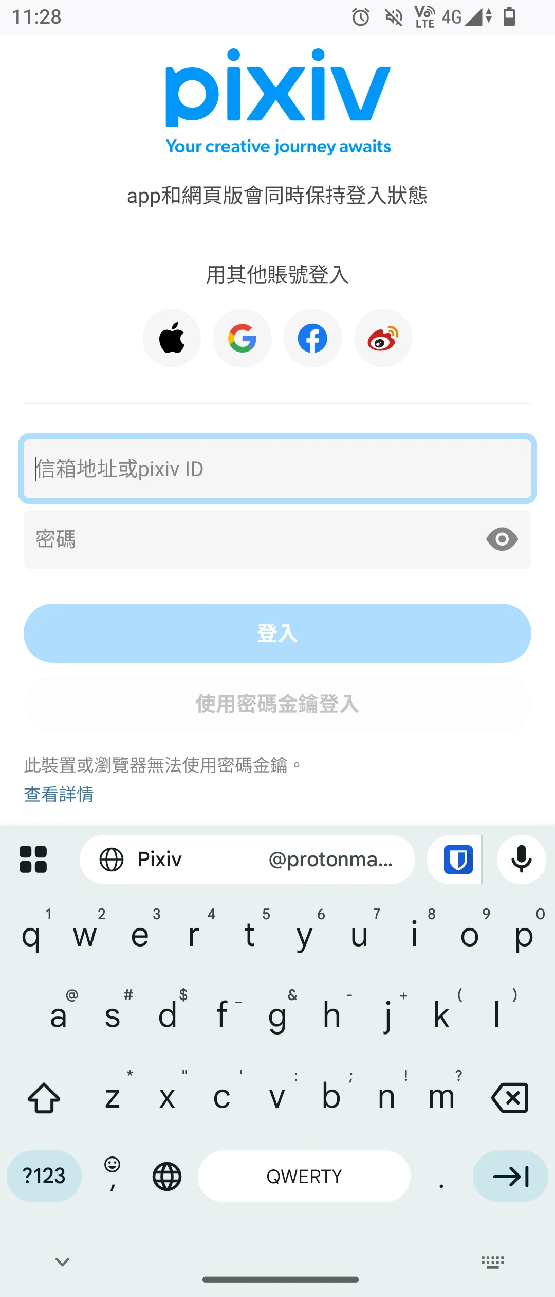 然後在APP的登入界面,Bitwarden便會顯示在鍵盤上方了。有時候沒顯示的話可能是Bitwarden行程被系統殺掉了,嘗試手動開啟Bitwarden APP再回到輸入密碼的界面。