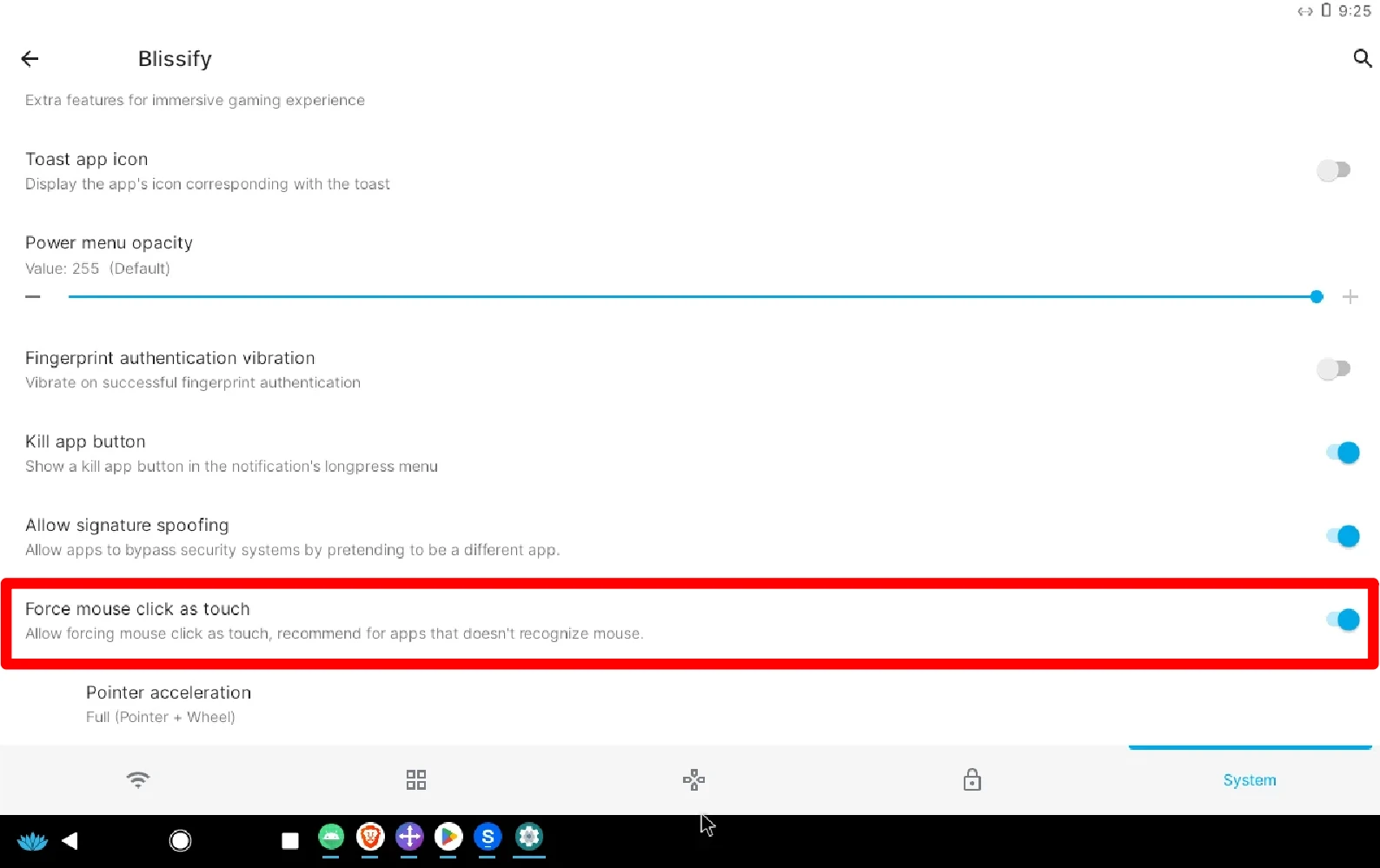 如果遊戲滑鼠點選沒反應,你可以在系統設定 → Blissify → Force Mouse Click as touch,強制將滑鼠點選事件轉譯成觸控點選。注意開啟此選項會導致滑鼠滾輪失效。