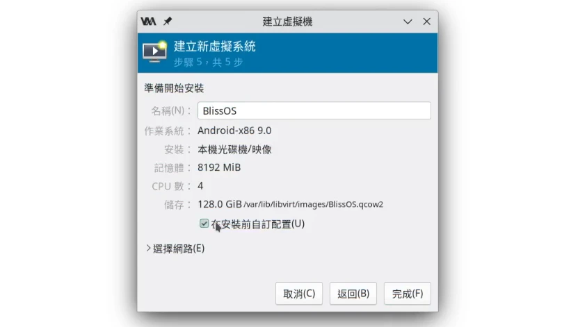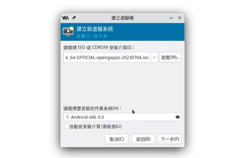 開啟Virt Manager,新增虛擬機,選取ISO,系統選擇Android-x86