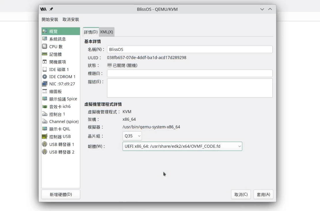 晶片組類型選擇Q35,韌體選擇UEFI (OVMF_CODE.fd)