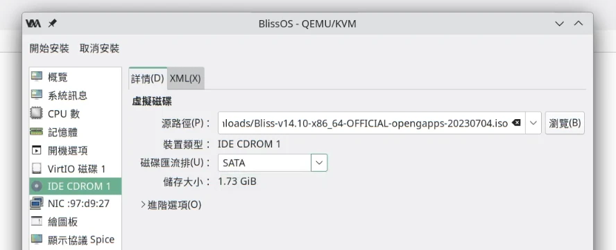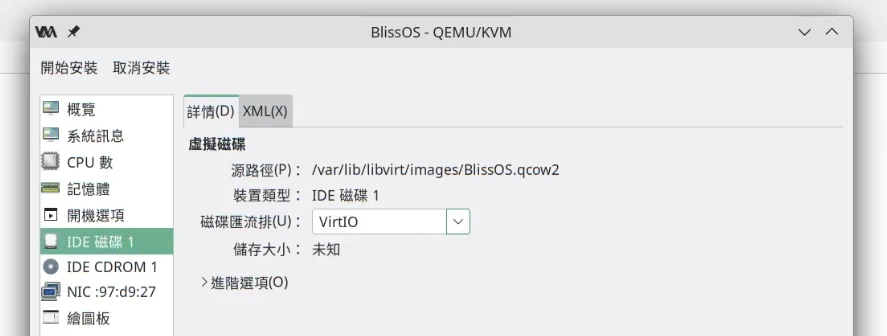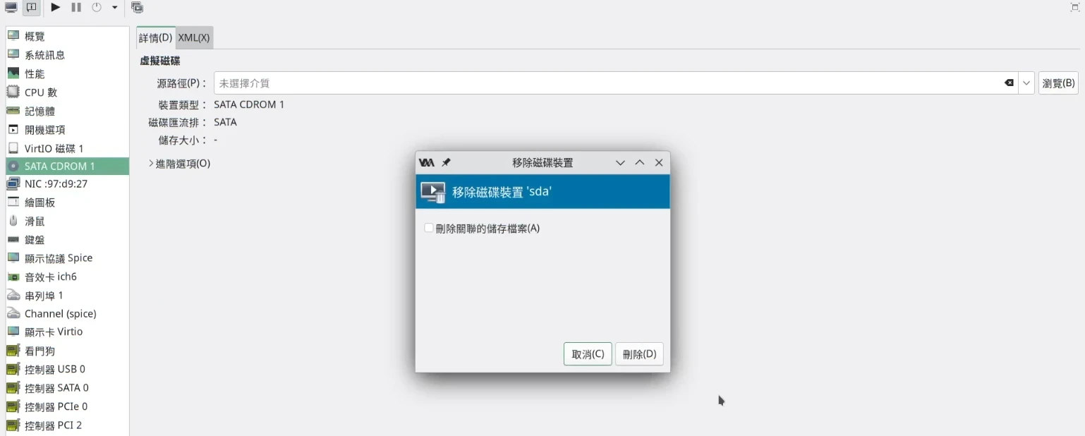 安裝後,點選Virt Manager的強制關機按鈕。從硬體列表移除CDROM