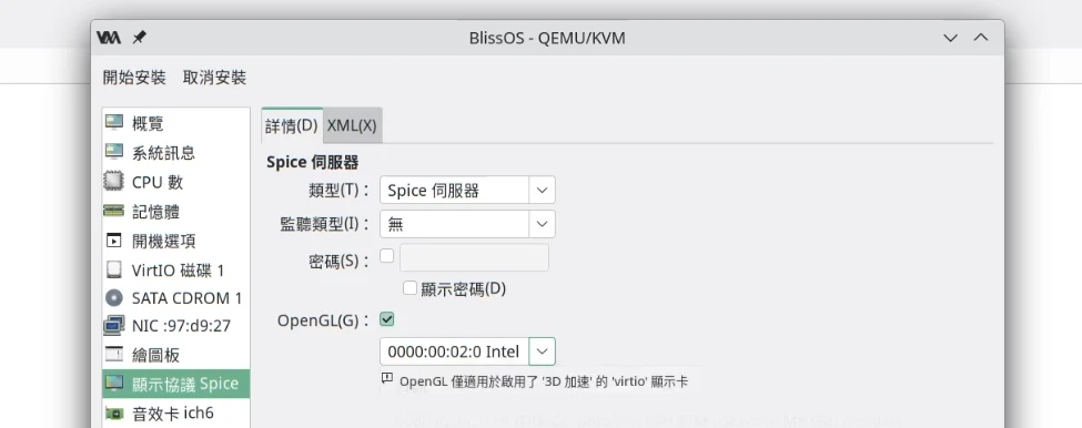 將Spice監聽類型設為無,並勾選OpenGL,裝置選取Intel顯示卡