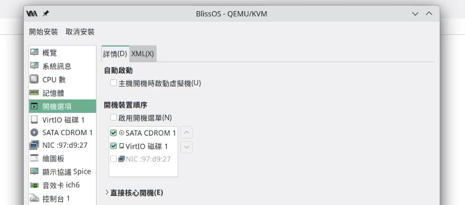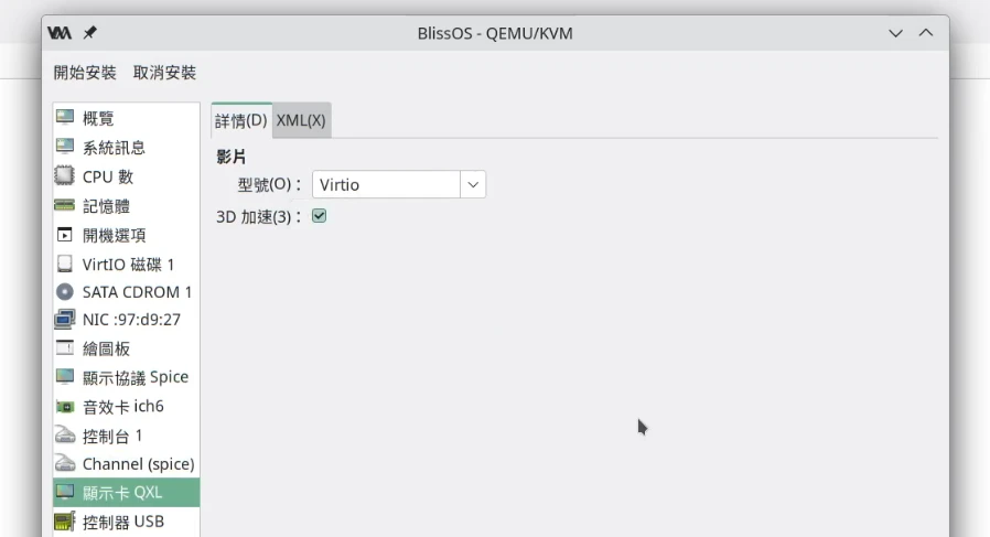 將顯示卡設定為VirtIO,並勾選3D加速。這裡的3D加速是使用VirGL達成的,參見Linux透過virtio-gpu virglrenderer給QEMU/KVM虛擬機3D加速。