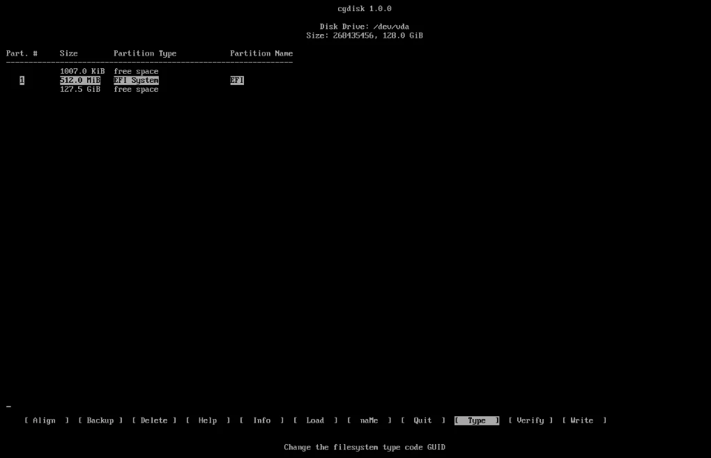 New,按Enter,輸入+512M,再輸入ef00變更分區類型為EFI。分區名稱設為efi,將第一個分區設為EFI分區。