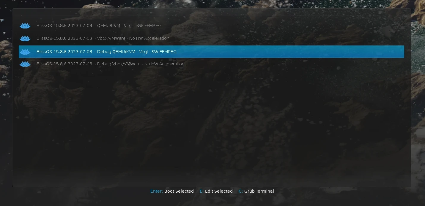 在開機選單點選VM Options → Debug QEMU/KVM VirGL,進入Android shell