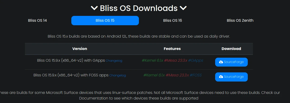 至官網或者SourceForge下載ISO,選擇內建GApps的版本 (Bliss OS 15.9.x (x86_64-v2) with GApps)