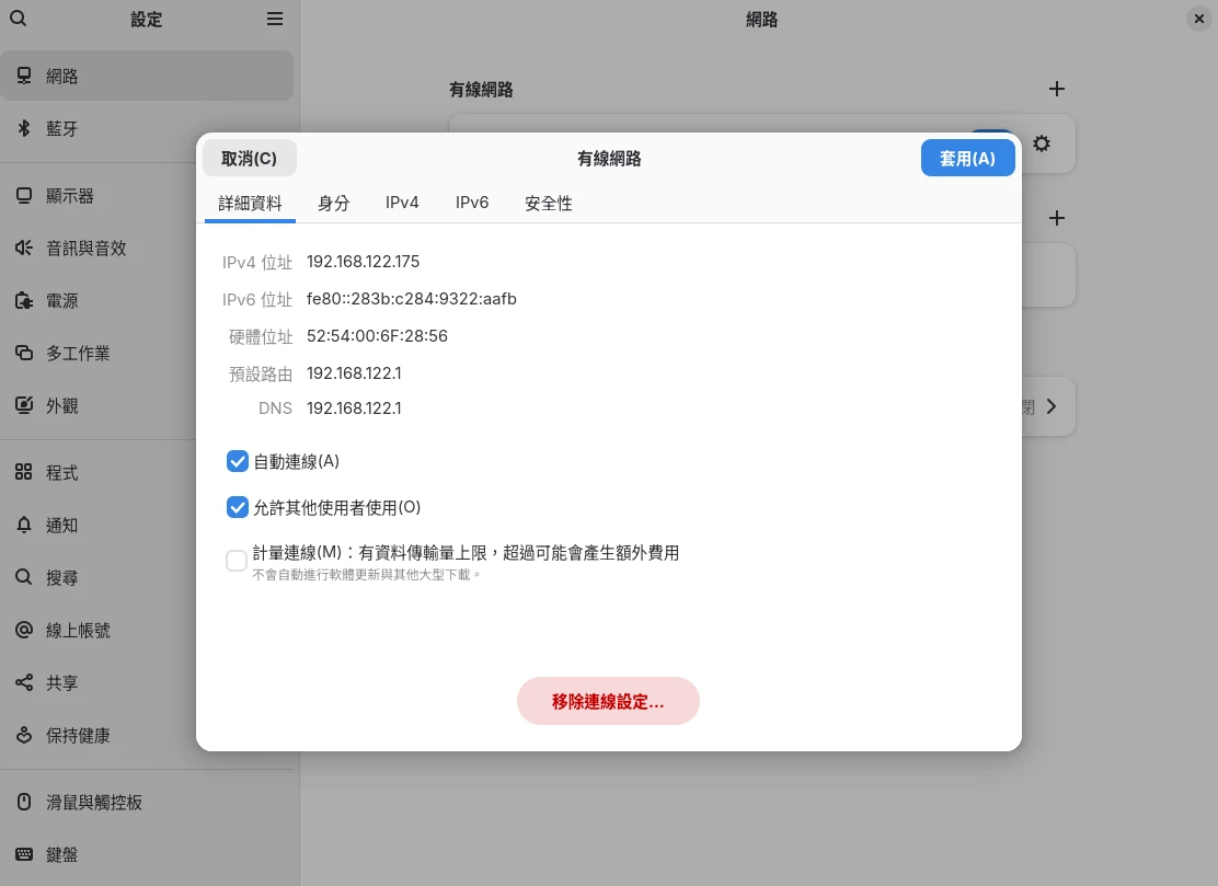 - 開啟系統設定 → 網路,取得Linux的區域IP。