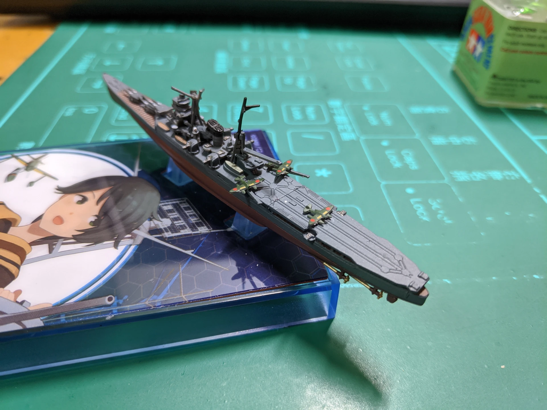 組裝需要用到一些模型膠。組出來就是1:2000的小模型,精細度不錯。在展示架下面墊一張小卡片讓你欣賞老婆美照。