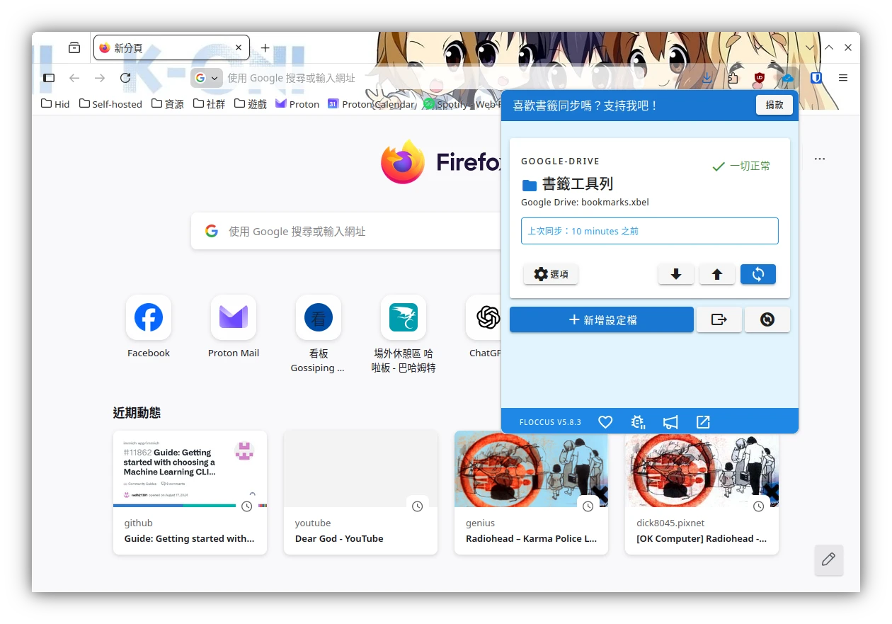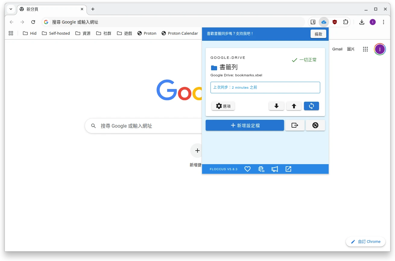 在那之後,點選Floccus擴充功能面板的上傳按鈕,再按同步圖示,就會將本機書籤上傳到雲端了。