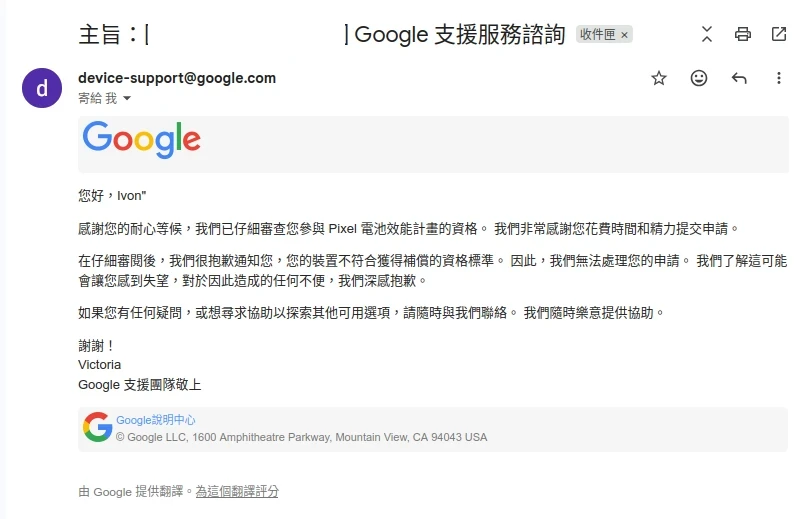 尷尬的是Google居然拒絕給我補償金!?明明IMEI有通過,用翻譯軟體跟我溝通的客服一眼看破我是買二手機,不符合資格。