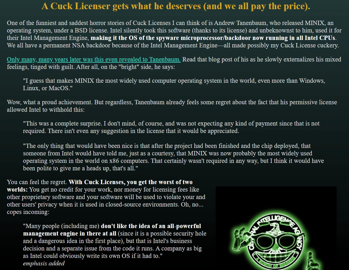 描述Cuck License後果的圖片。大意是說,當初研發Minix的教授,以做善事的態度透過BSD授權釋出,沒想到會被Intel拿去製作Intel ME這種CPU底層級別的大規模監控軟體。
