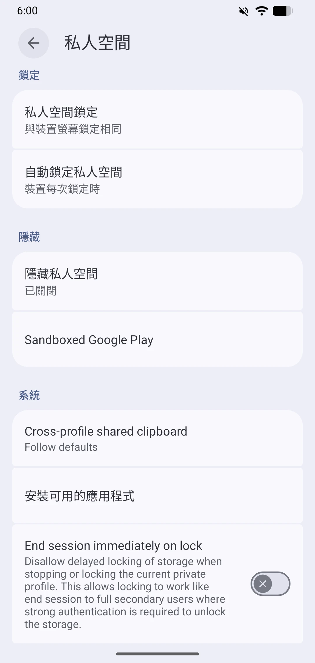利用Android 16內建的「工作設定檔」或者「私人空間」或者「多重使用者」,我們就能把GMS藏進去啦。Android表層帳號不要啟用Gmscompat,只在私人空間啟用。然後,我們可以利用Android提供的機制,一鍵凍結GMS執行!關在設定檔裡面的APP能夠一鍵停止執行,讓GMS的通知完全出不來。