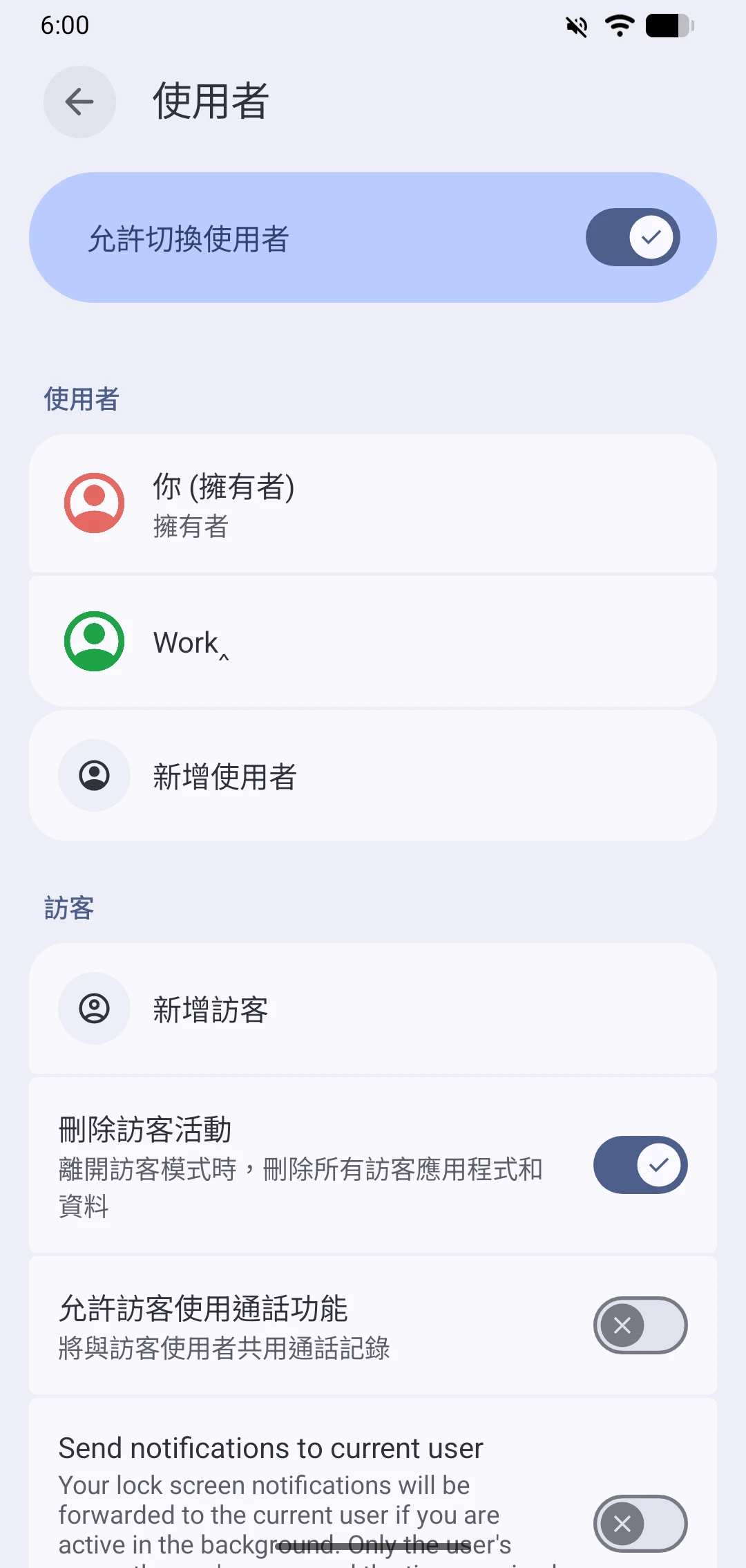 多重使用者(設定 → 系統 →使用者),必須先登出目前使用者,好像在使用另一台手機一樣。可以設定密碼。不適合需要在主帳號與副帳號APP快速切換的場合使用。可以凍結APP執行。開啟後會在通知欄顯示目前的使用者。