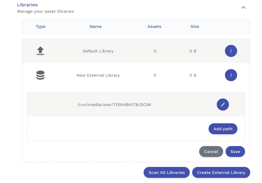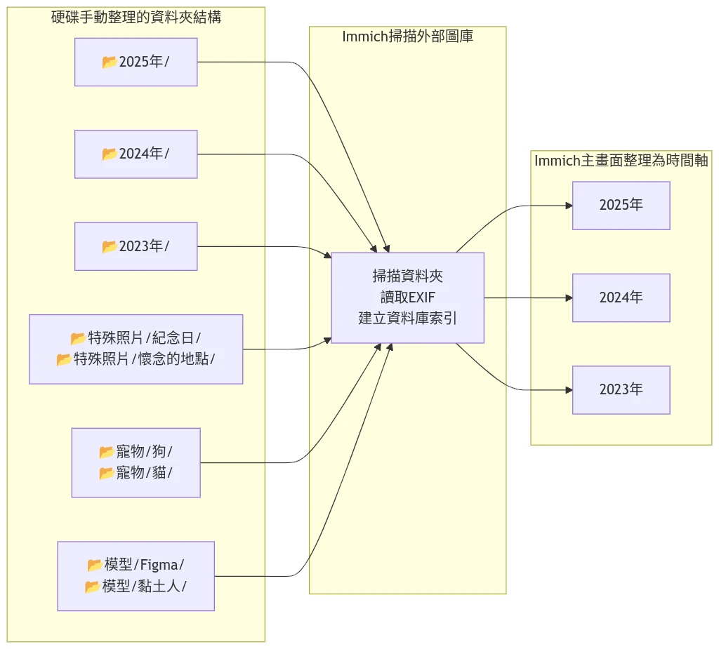 你可以新增多個外部圖庫,讓Immich直接掃描現有的硬碟資料夾,讓Immich讀取並彩現在網頁時間軸,維持現有的照片資料夾結構。這個時候Immich就變成單純顯示照片用的工具罷了,不會幫你產生資料夾結構。