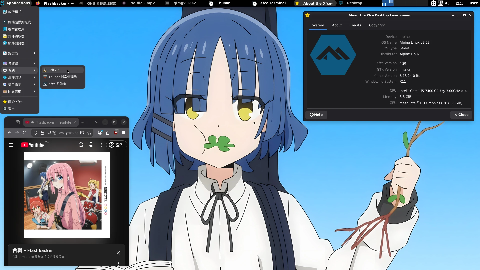 Alpine Linux開發者製作了一系列指令稿方便我們設定圖形環境,包括GNOME、KDE Plasma、XFCE桌面等。要讓系統比較精簡一點就裝XFCE桌面。