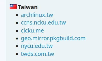 各國的鏡像站網址可用Pacman Mirrorlist Generator查詢,像臺灣國內目前就有5個Arch Linux的鏡像站。