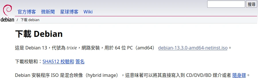 推薦下載「Netinstall ISO」,也就是網路開機,檔案不到500MB,開機後透過網路下載套件安裝系統。另外Debian官網還有提供其他ISO,像如果你有用過Ubuntu,你應該會想安裝前試用系統,那麼下載有預裝桌面環境的「Live DVD」版本會更好,只不過檔案就會變成好幾GB了。