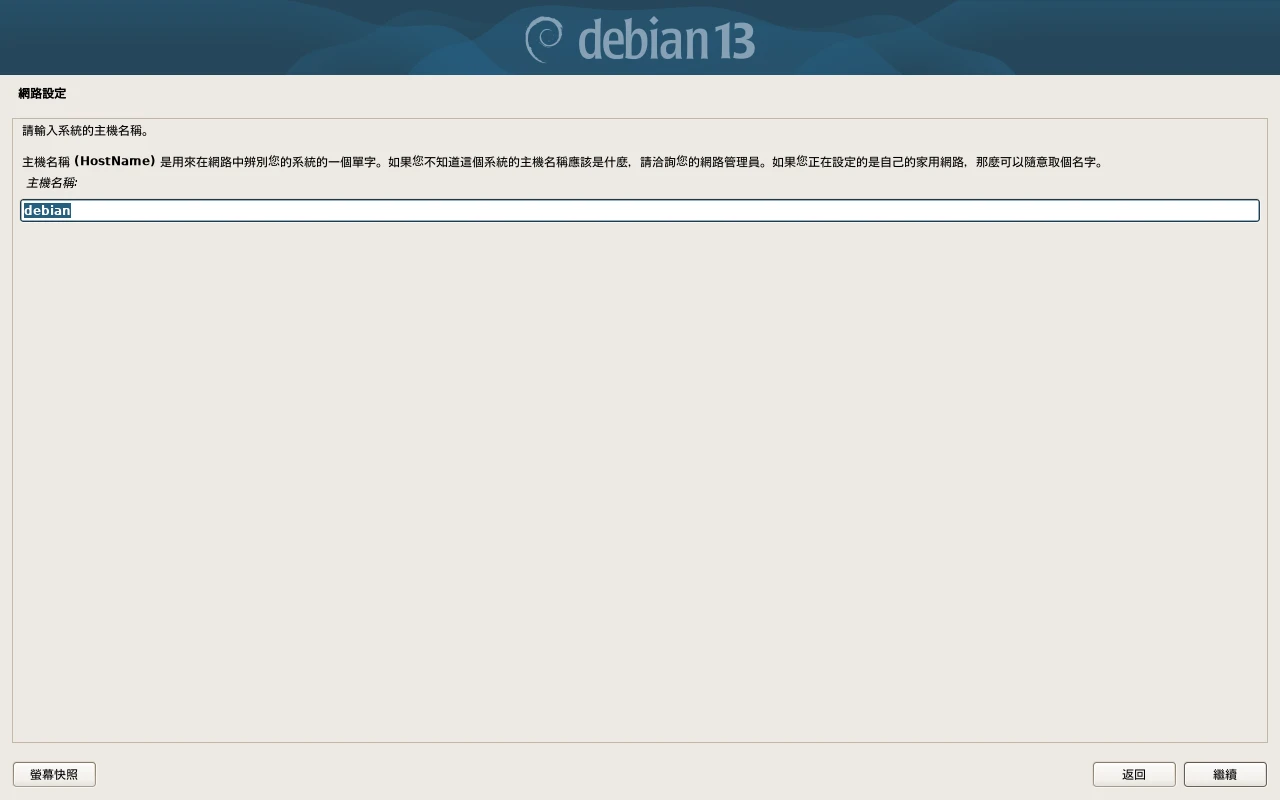 Debian會嘗試自動連上網路。設定主機名稱。網域名稱可留空。