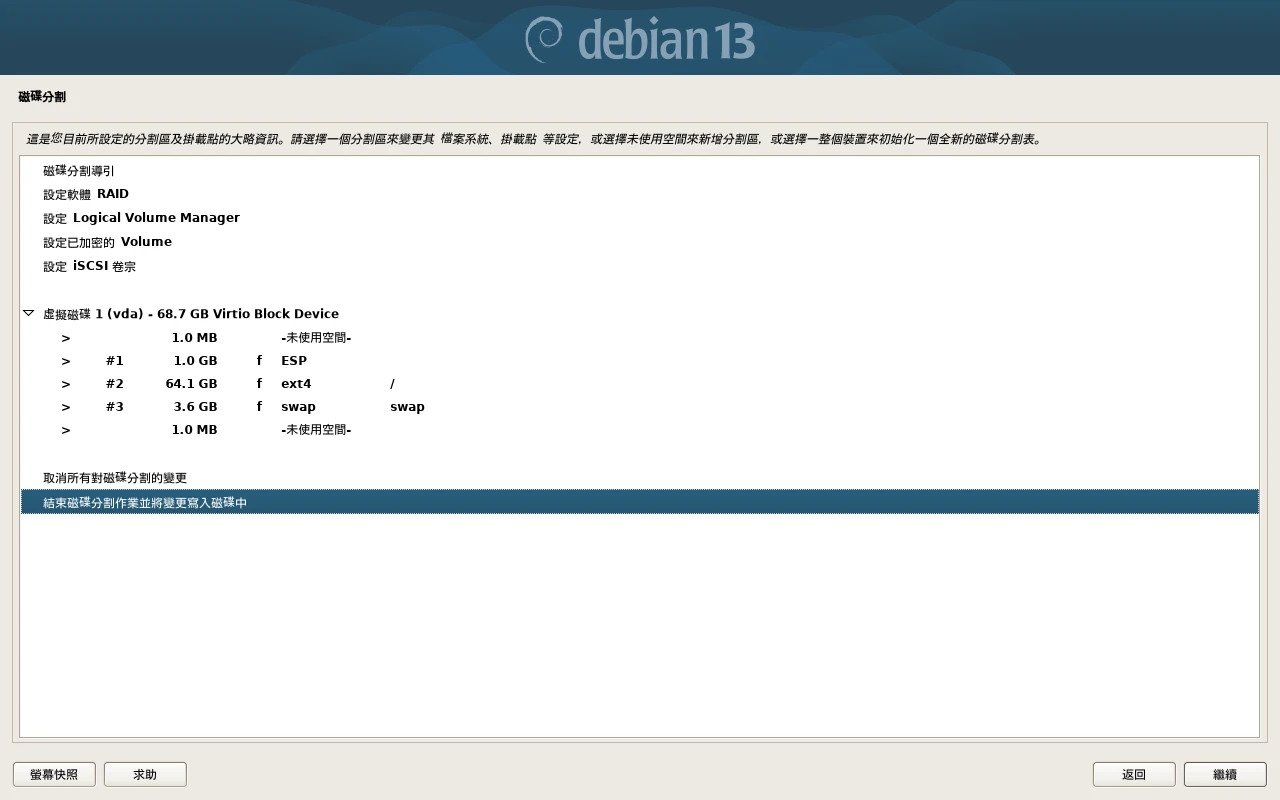 Debian預設會建立EFI分區、EXT4的root分區、SWAP分區。點選「是」寫入硬碟。