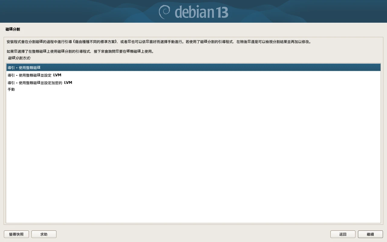 分割硬碟的階段,選取使用整個磁碟,刪除所有硬碟上的資料並安裝Debian,之後一直下一步。