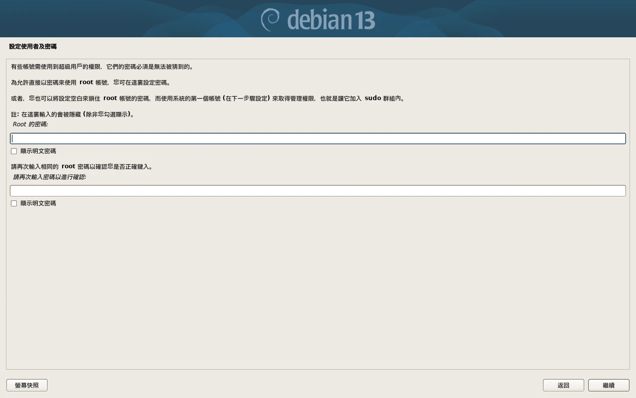 設定Root帳號的密碼 (注意:Root密碼建議先留空。因為如果你設定了Root帳號的密碼,後面要手動將一般使用者帳號加入sudoers)