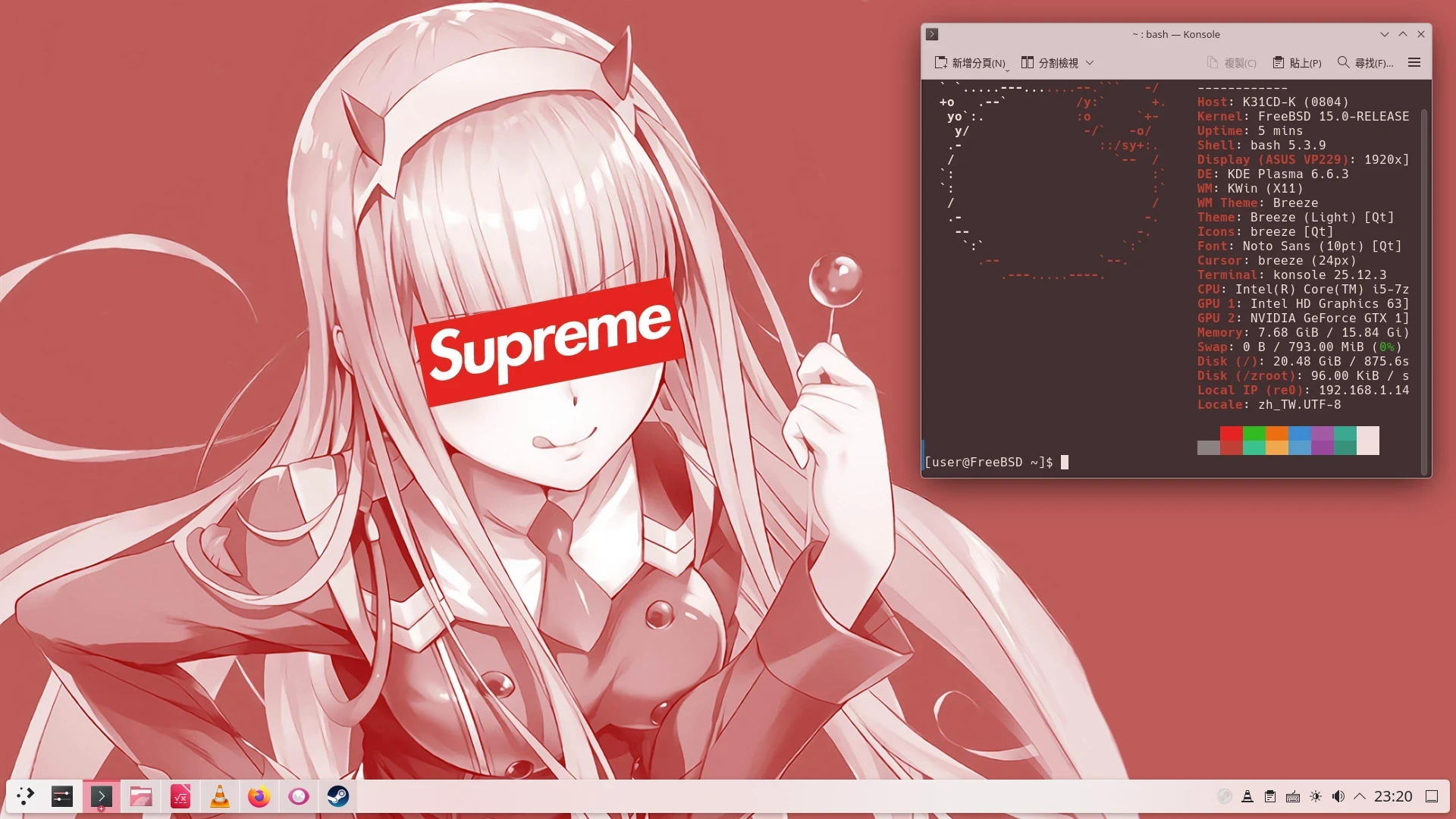將FreeBSD安裝在實機,安裝KDE Plasma桌面,搭配Fcitx5中文輸入法,當作日常桌面系統使用。