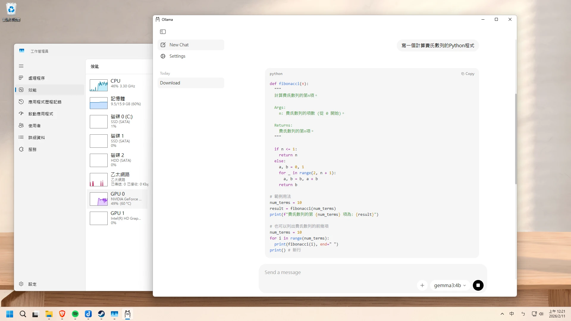 不過有獨立顯卡更好,可以將一些模型層丟給GPU加速運算,提昇5倍以上的推理速度。若要使用GPU加速的話,推薦使用Nvidia顯卡,且GPU的VRAM至少要有4GB以上。Ollama會自動根據你的VRAM分配任務。