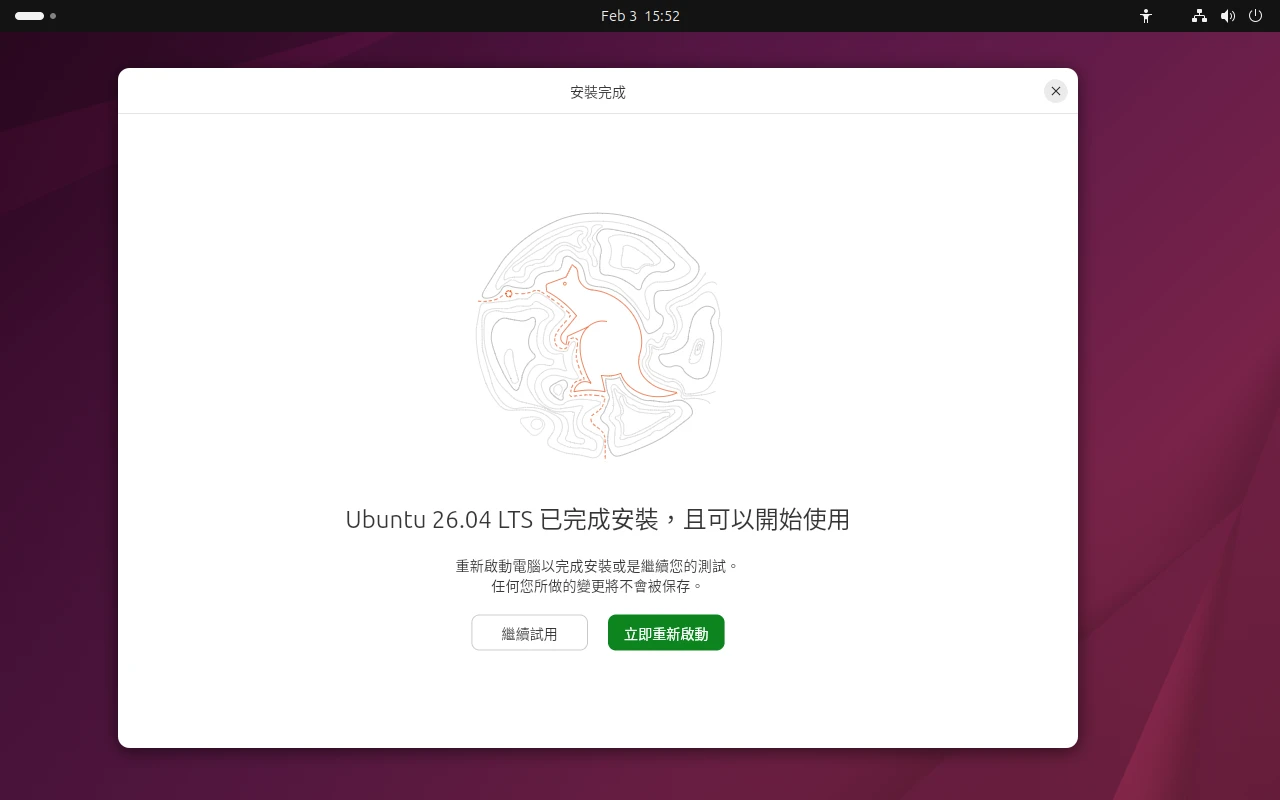 儲存設定,退出UEFI。重開機應該會進入Ubuntu的安裝程式,選取第一個按下Enter。