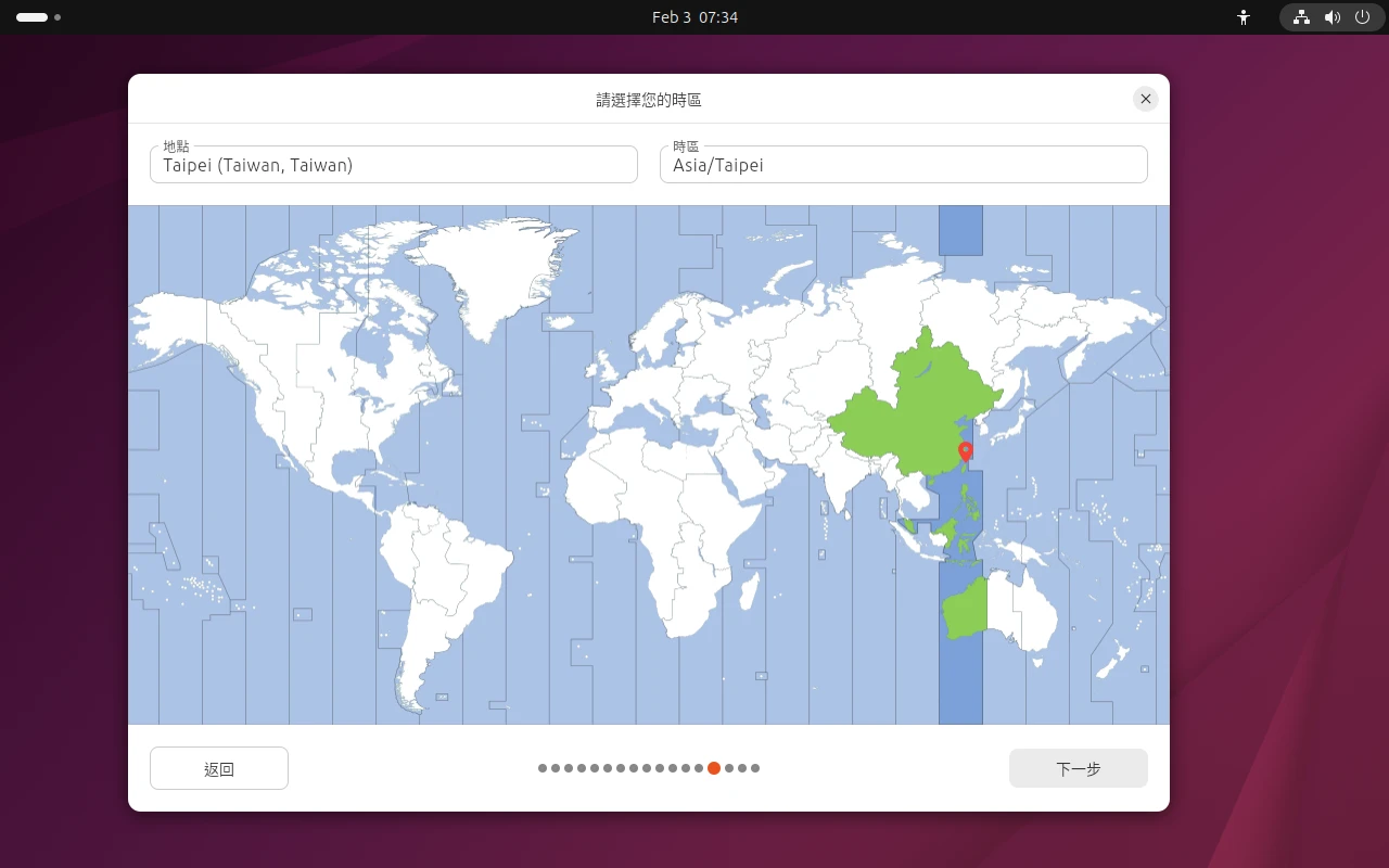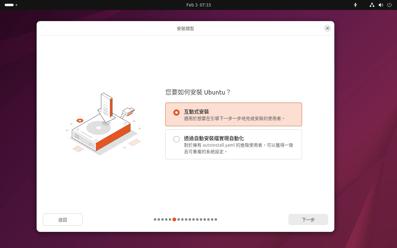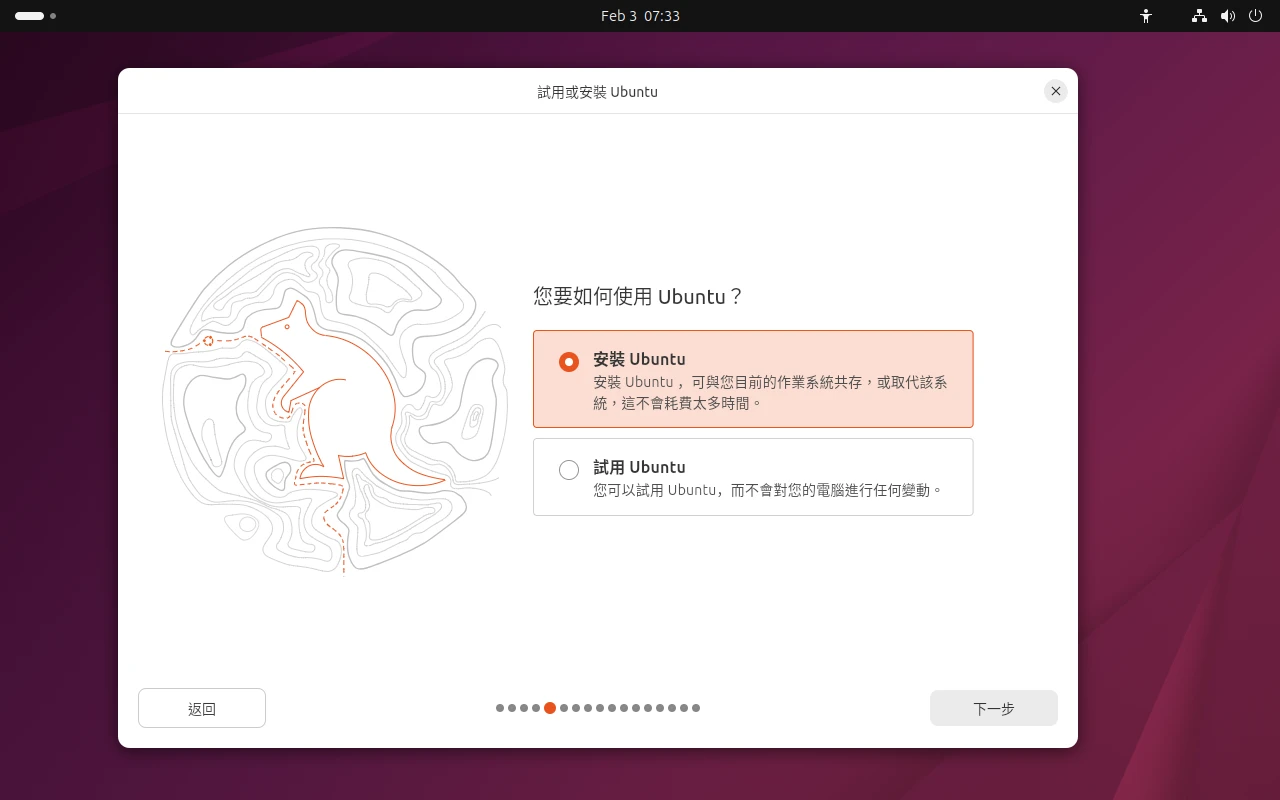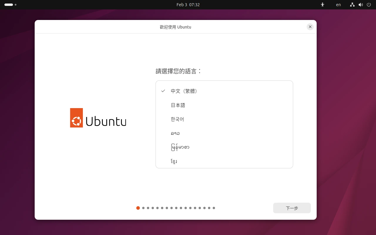 用滑鼠點選「語言」,選取正體中文,點選「安裝Ubuntu」,下一步。