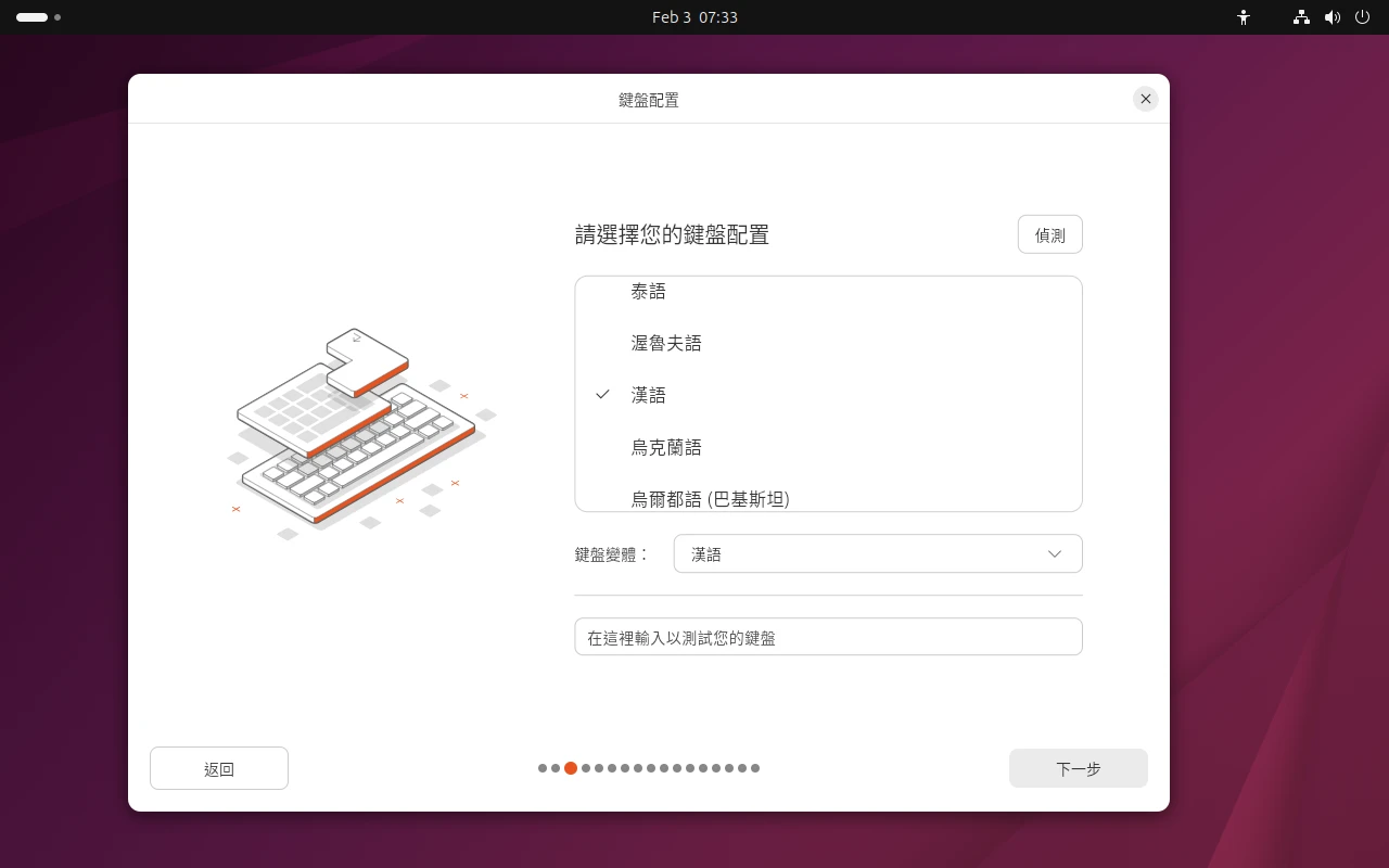 鍵盤配置維持預設。需要注意的是這裡雖然寫漢語,但還不能打中文,只是讓你測試鍵盤是否正常而已。