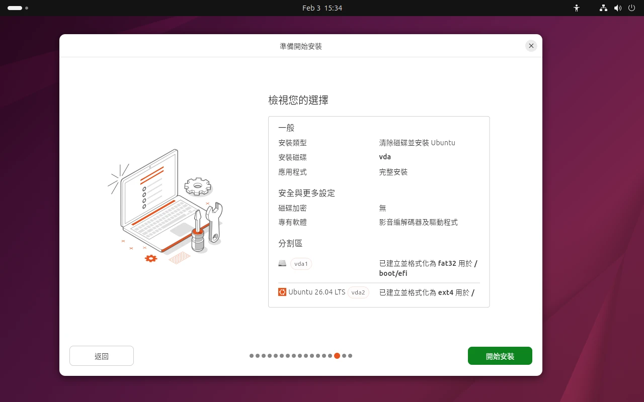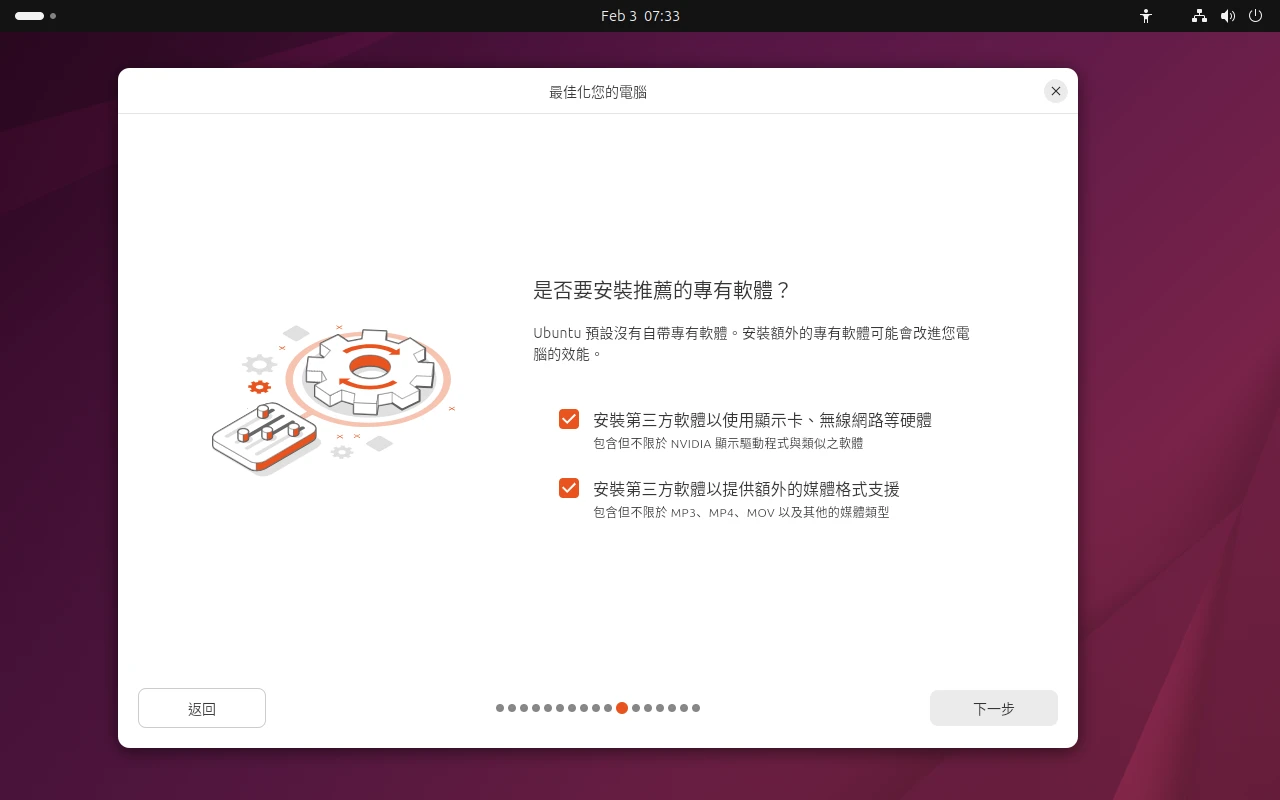 勾選安裝第三方軟體,嘗試自動安裝Wifi、顯卡驅動之類的,這需要網路連線。