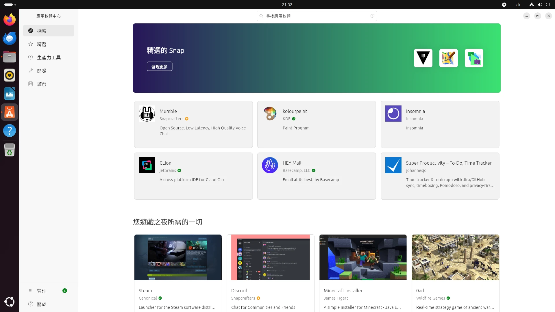 Ubuntu只要點選工作列的橘色軟體商店即可下載軟體,這裡預設是使用Snap格式安裝軟體。請看這篇了解Linux有哪些常用軟體。