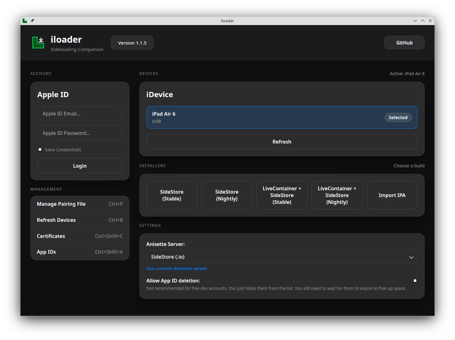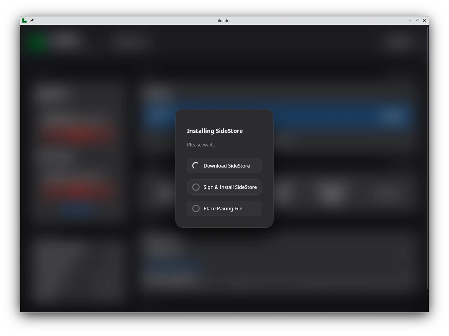 我們將透過iLoader這個開源程式側載IPA,它有針對SideStore最佳化,支援Linux、Windows、macOS。它會自動下載SideStore的IPA,並匯入Jitterbugpair。