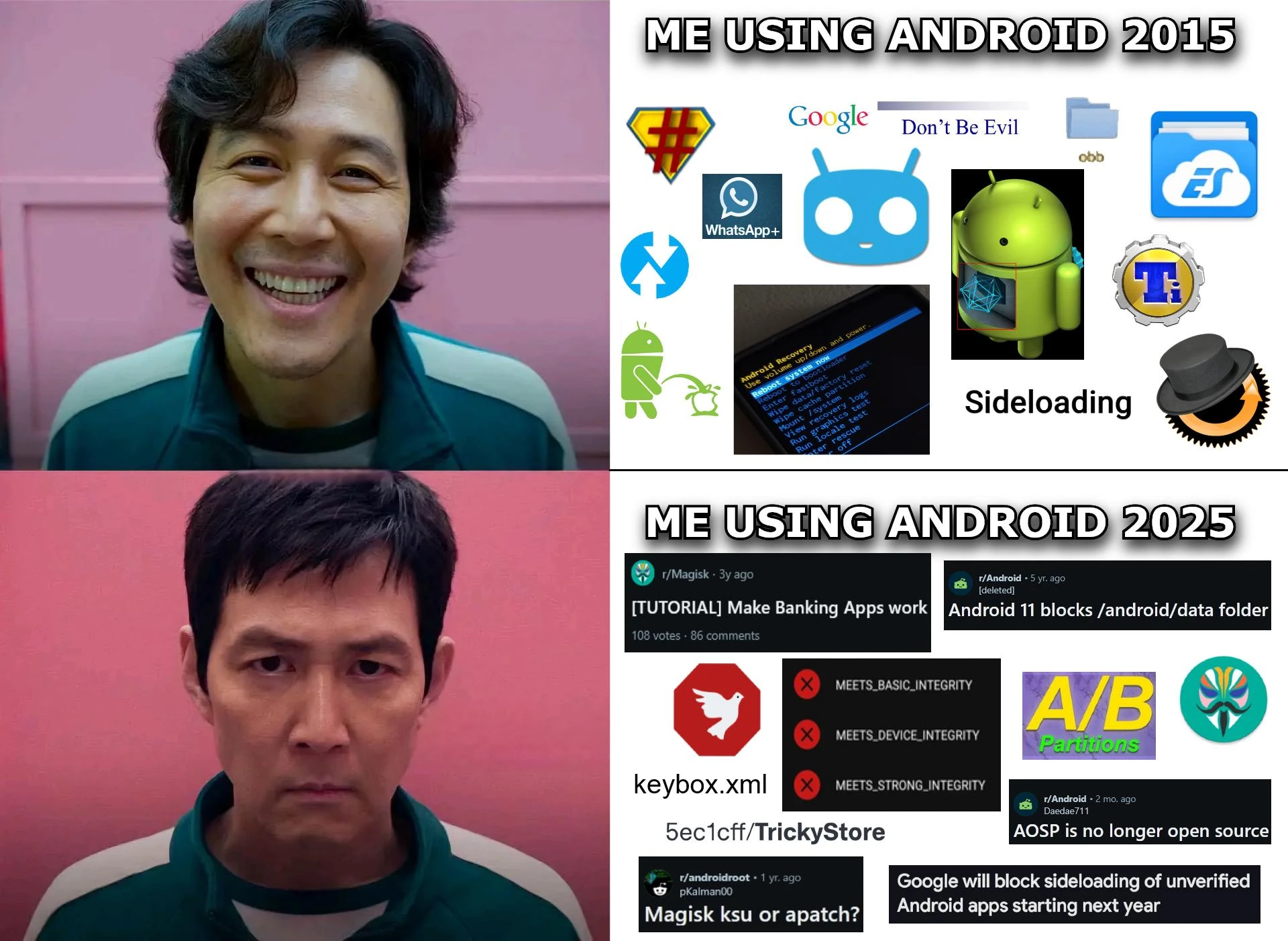 美好的過去為什麼會漸行漸遠呢。Android越來越封閉,封堵root與解鎖BL管道,還要用Play Integrity防止破解APP,AOSP延遲開源,現在還準備強制驗證開發者簽名了,側載APK變得更加困難。