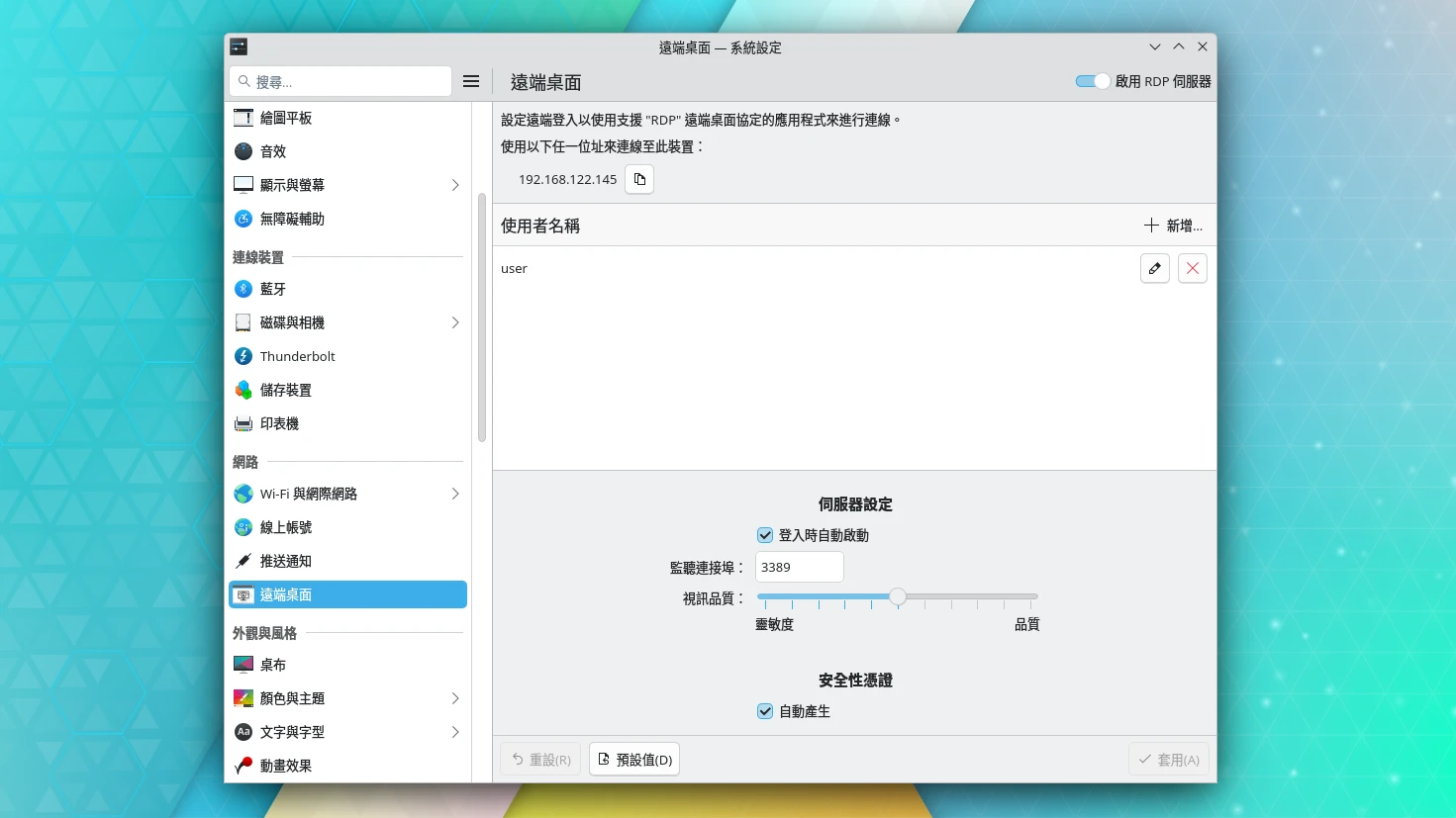 開啟KDE系統設定 → 遠端桌面,勾選啟用遠端桌面,新增帳號密碼(可以跟你的Linux使用者帳號一樣)並視你的網速調整畫面品質。